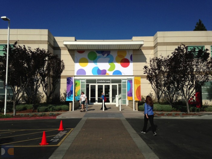 Apple's media event is tomorrow and they are just starting to decorate where the event will be held with colorful banners. They are being hung at the campus Town Hall, where the event will be held. These banners look like the invitation they sent out. There are colored orbs around a simple Apple logo.